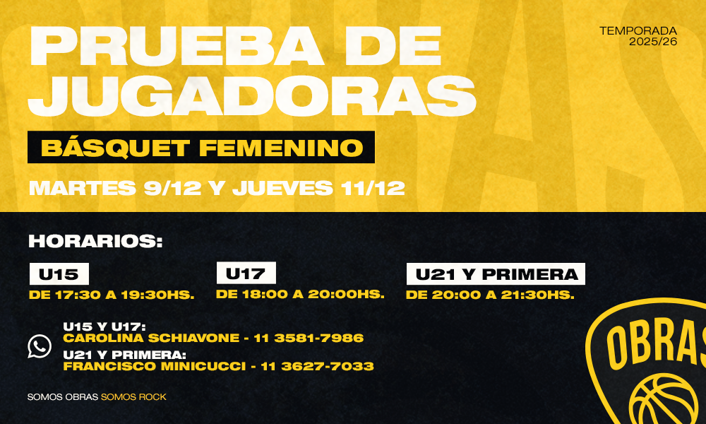 El básquet femenino de Obras fijó las fechas de diciembre en las que realizará prueba de jugadoras para la Temporada 2026, tanto de las Formativas como de la Primera.